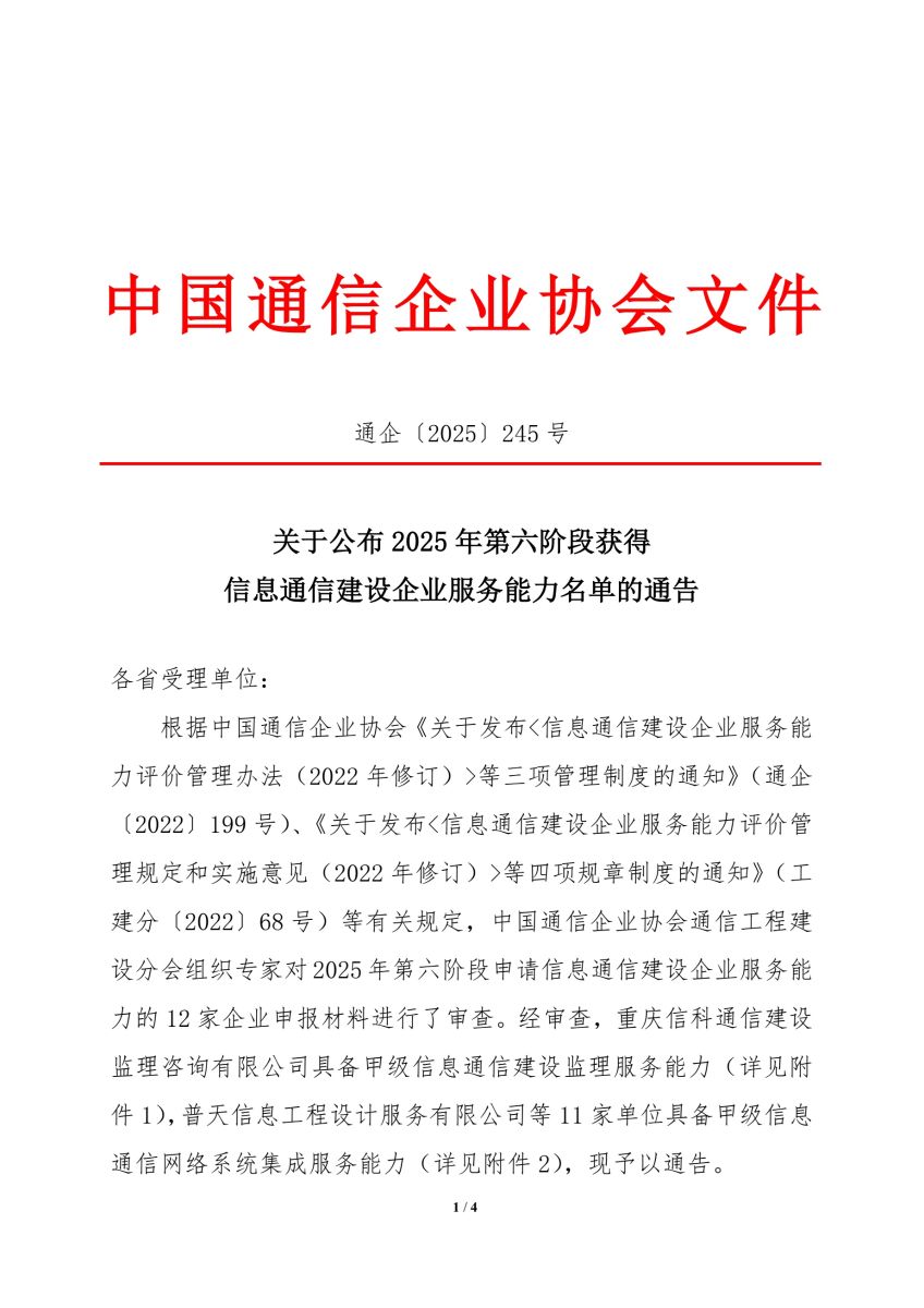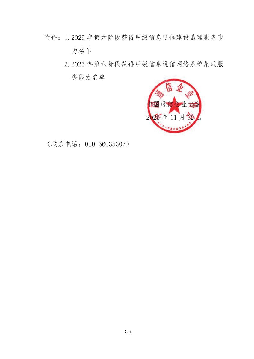 关于公布2025年第六阶段获得信息通信建设企业服务能力名单的通告
